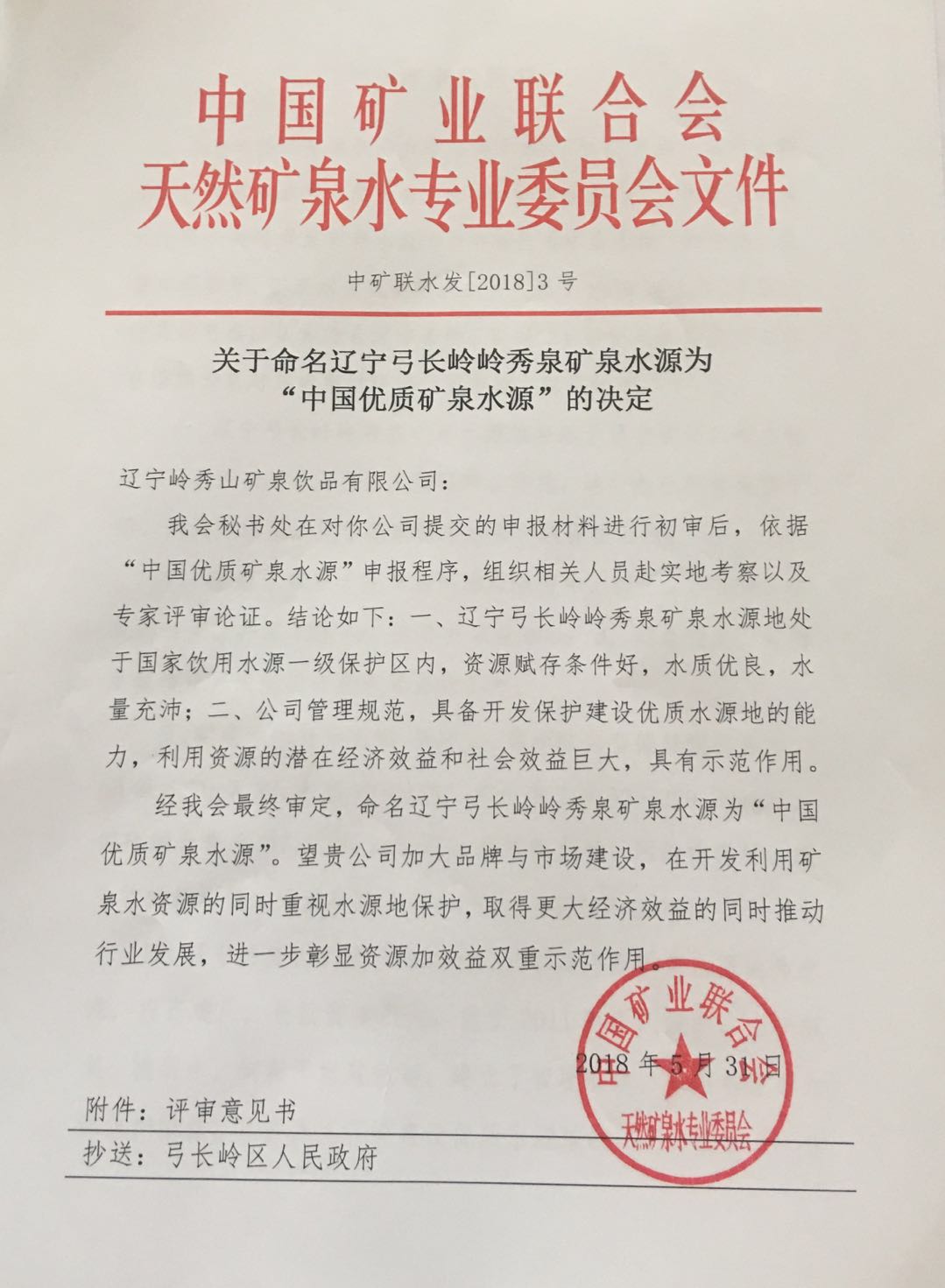 2018年5月24日,评审活动终于尘埃落定,欧宝网页版登录入口“岭秀泉”最终获得“中国优质矿泉水源”的称号。
