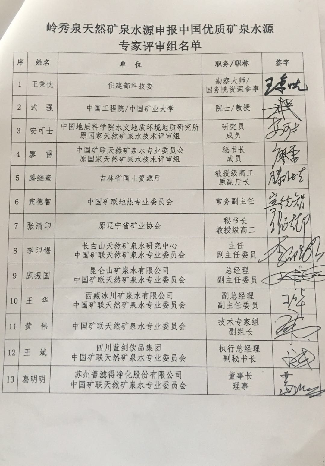 此次岭秀泉天然矿泉水源申报中国优质矿泉水源的评审专家由建筑部科技委国务院资深参谋、勘测大师王秉忱,中国工程院、中国矿业大学院士教授武强,中国地质科学院水文地质环境地质研究所、原国家天然矿泉水技术评审组研究员安可士,中国矿联天然矿泉水专业委员会、原国家天然矿泉水技术评审组秘书长廖雷,吉林省国土资源厅教授级高工、原副厅长滕继奎,中国矿联地热专业委员会常务副主任宾德智,原辽宁省矿业协会秘书长、教授级高工张清印,长白山天然矿泉水研究中心、中国矿联天然矿泉水专业委员会主任、副主任委员李印锡,昆仑山矿泉水有限公司、中国矿联天然矿泉水专业委员会总经理、副主任委员庞振国,西藏冰川矿泉水有限公司、中国矿联天然矿泉水专业委员会副总经理、副主任委员王华,中国矿联天然矿泉水专业委员会技术专家组副组长黄伟,四川蓝剑饮品集团、中国矿联天然矿泉水专业委员会执行总经理、副秘书长王斌,醴云矿泉水有限公司、中国矿联天然矿泉水专业委员会董事长、理事张伟,苏州普虑得净化股份有限公司、中国矿联天然矿泉水专业委员会董事长、理事葛明明审评。