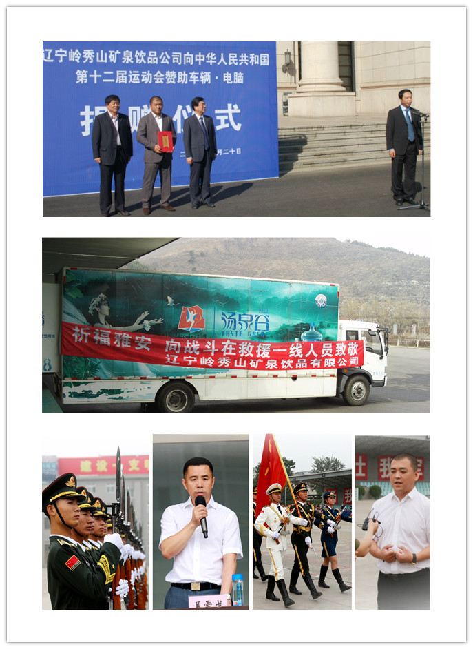 岭秀山集团曾参与扶贫贫困村、向灾区雅安捐献矿泉水、赞助全运会等社会活动;为进一步助力深化辽阳“全国双拥模范城“创建成果,更好的促进辽阳市与人民军队的鱼水深情,响应号召向中国人民解放军三军仪仗队捐赠汤泉谷矿泉水。这不仅是岭秀山一直秉承的企业宗旨,也应该是所有企业家应担当的责任和义务。